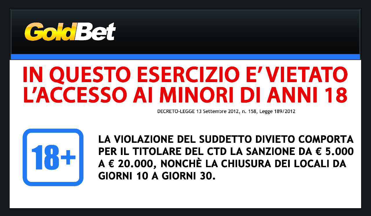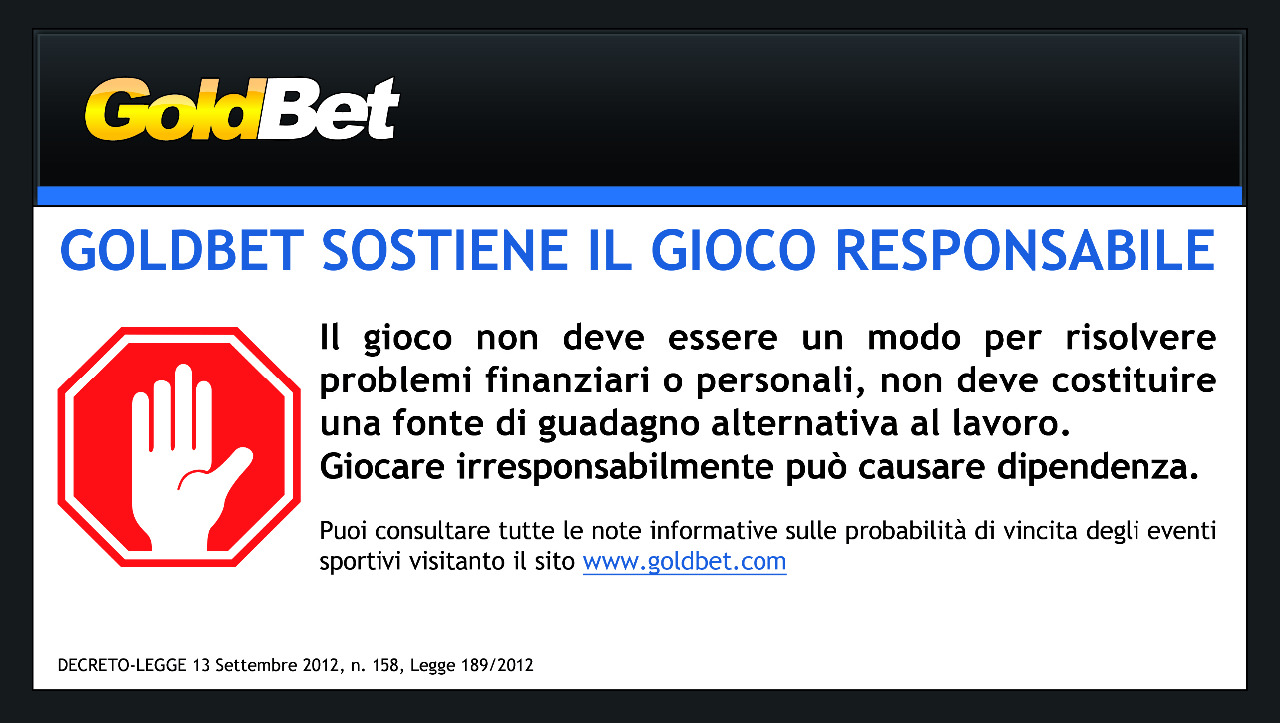 Giocare irresponsabilmente può causare dipendenza.Puoi consultare tutte le note informative sulla probabilità di vincita degli eventi sportivi e visitando www.goldbetsports.com (ai sensi di quanto disposto dall'art. 7 D.L. 158/12)